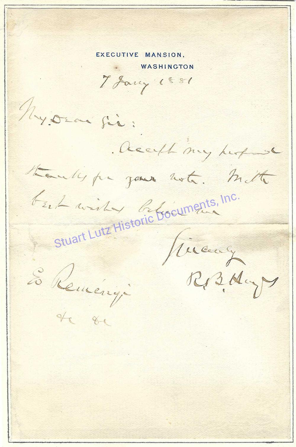 ALS. 1pg. 5” x 7”. January 7, 1881. Washington. An autograph letter signed “R.B. Hayes” as President on “Executive Mansion” letterhead. He wrote to the violinist Ede Reményi who performed for the President at the White House: “7 Jany 1881 My Dear Sir: Accept my profound thanks for your note. With best wishes believe me Sincerely, R. B. Hayes Ed. Reményi &c &c”. The letter is inlaid and the blank third page has a small hole in it that does not affect the President’s handwriting. |